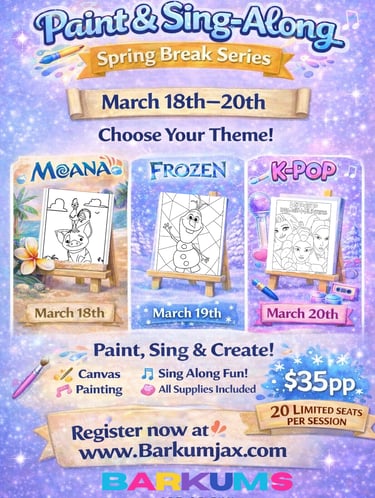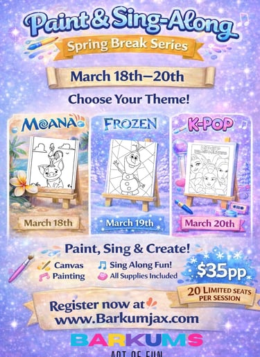 Join us for 3 themed days of creativity and fun! Kids ages 5–12 will enjoy 2 hours of painting their favorite character-inspired designs while singing along to Moana (March 18), Frozen (March 19), and K-Pop (March 20) hits. All supplies included. $35 per session. Only 20 seats per session — reserve your spot today!