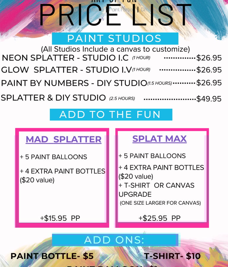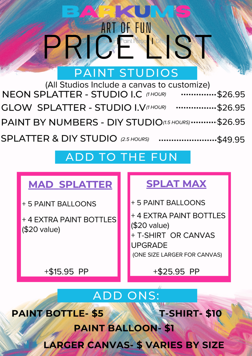 ADMISSION TO ALL STUDIOS INCLUDE A CANVAS TO CUSTOMIZE BUT FEEL FREE TO GRAB A PACKAGE DEAL OR ADD ON AS YOU GO!